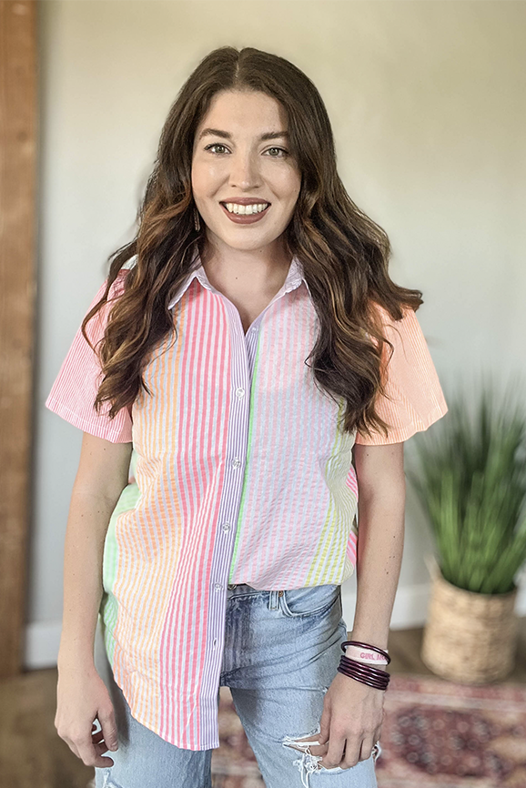 Fun seersucker color block top! Full button down with a little puff sleeve to give it that extra look!