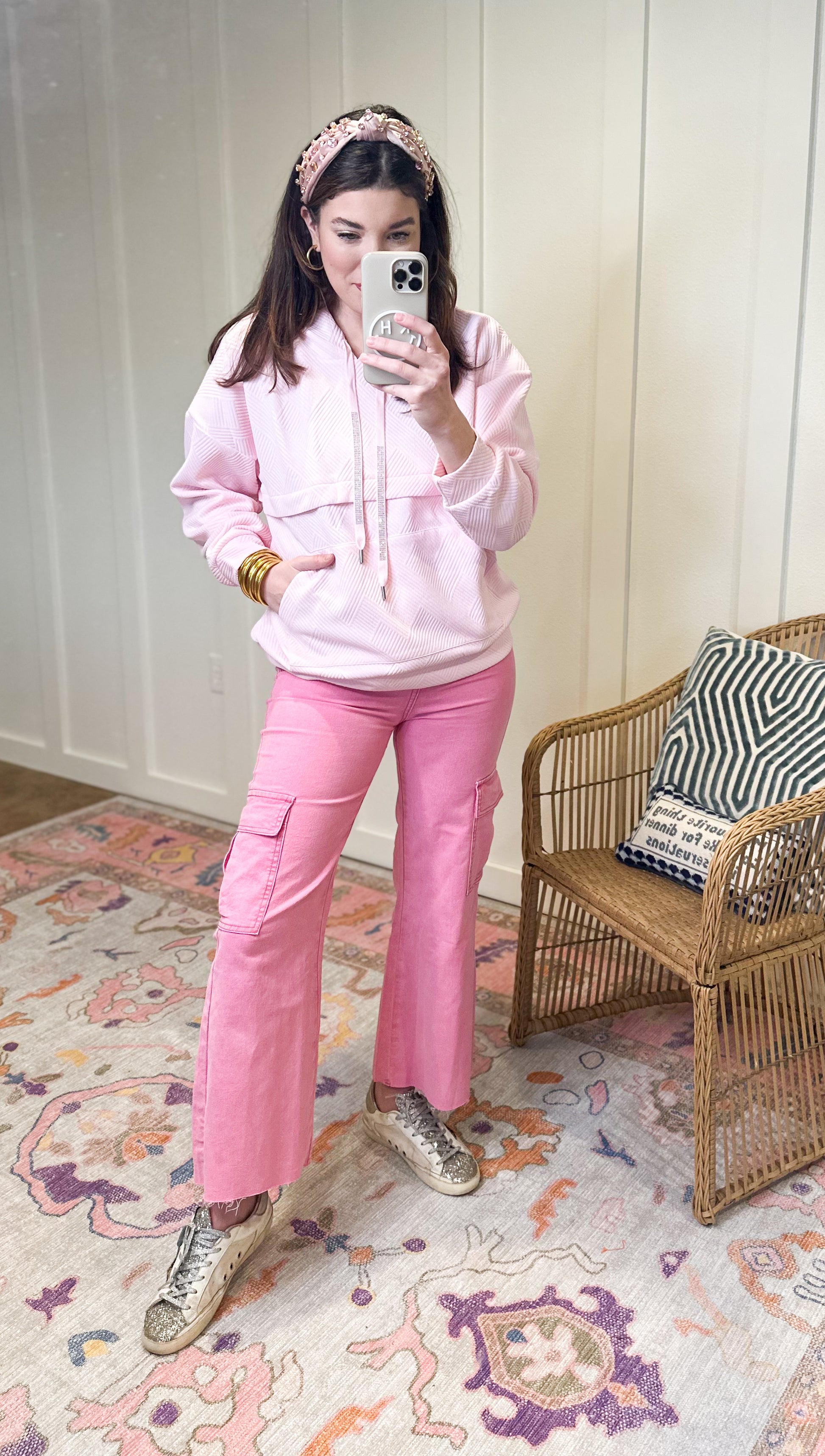 Kaits in the size M, could size down to S in this hoodie! 5'7 - Size 28 bottom - size M top.