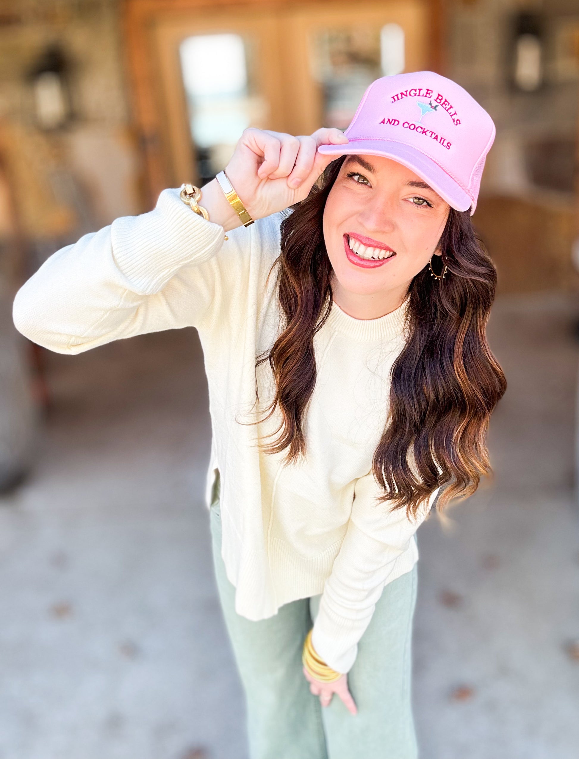 Jingle Bells & Cocktails Trucker hat in baby pink!