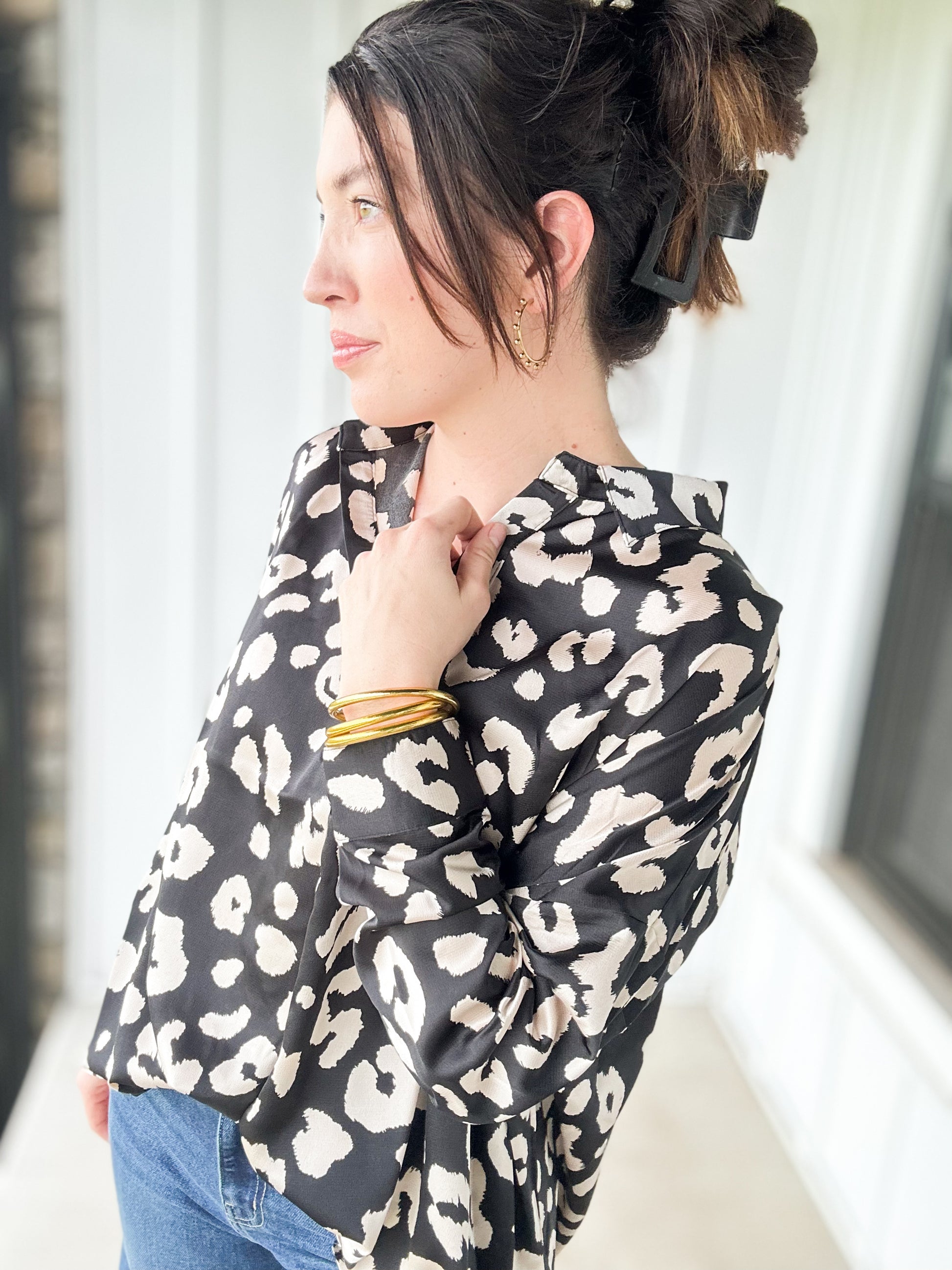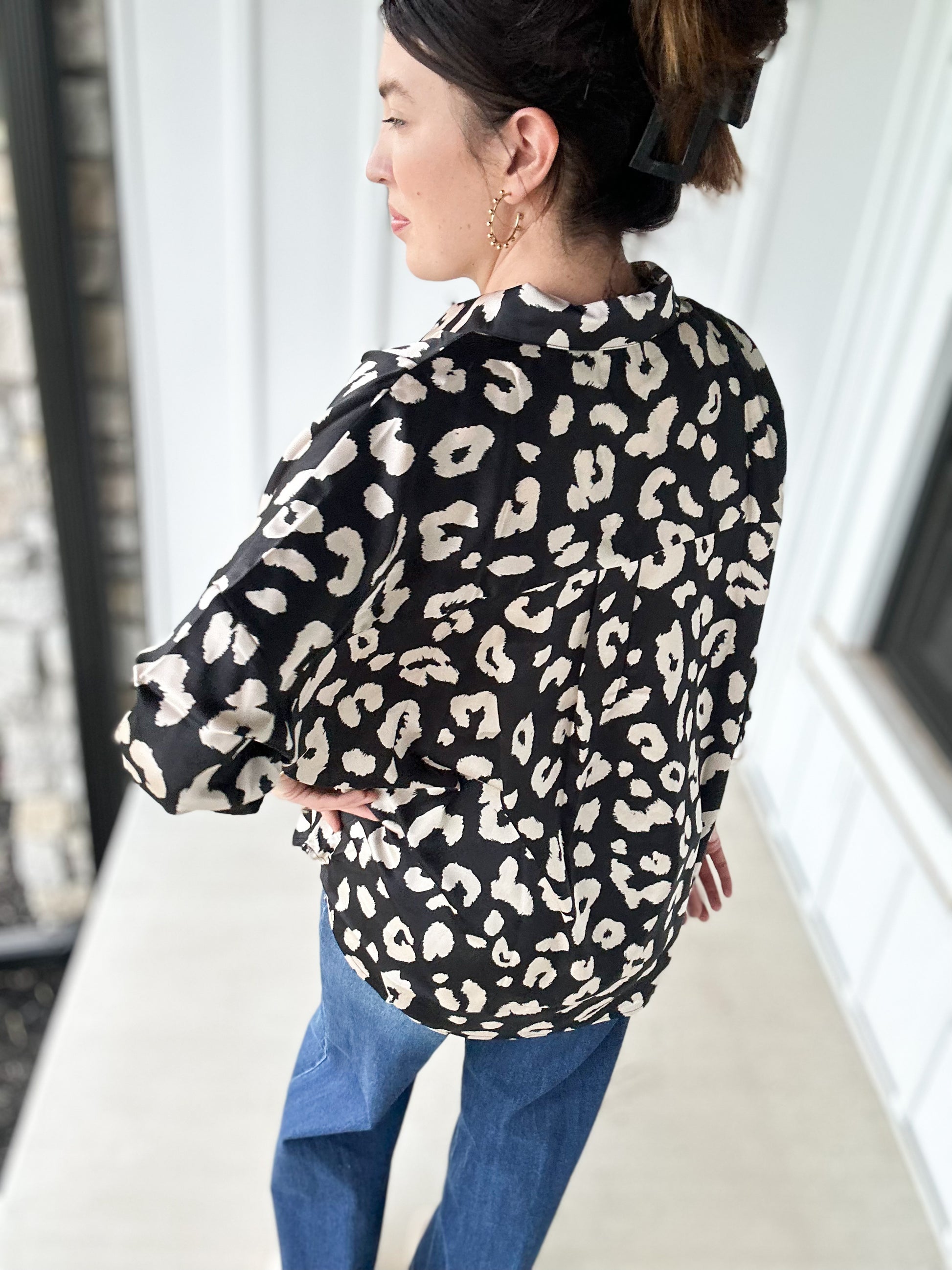 V-neck blouse top with a collar and button cuffs! Flowy and comfy. The leopard print is the prettiest cream color!