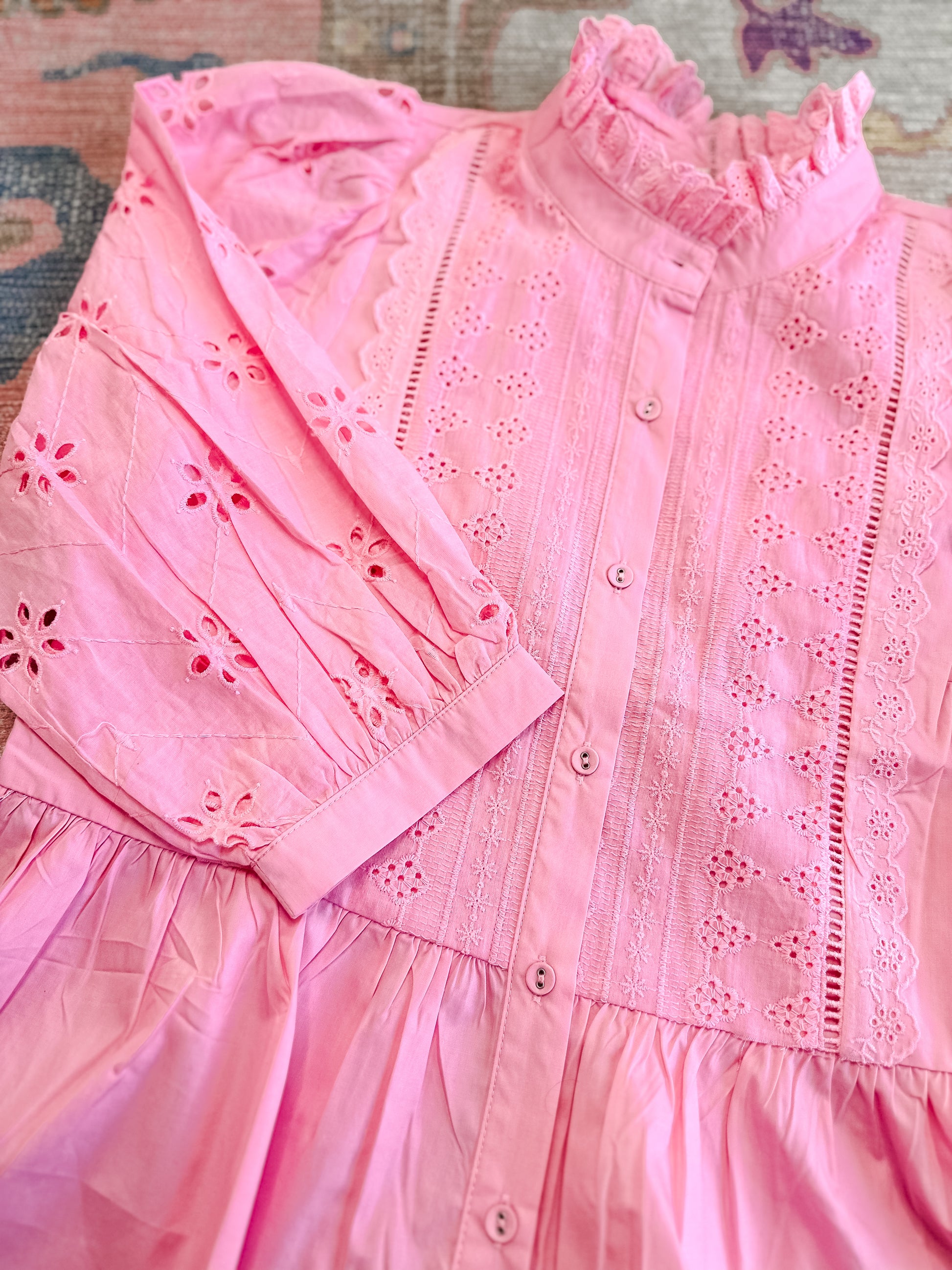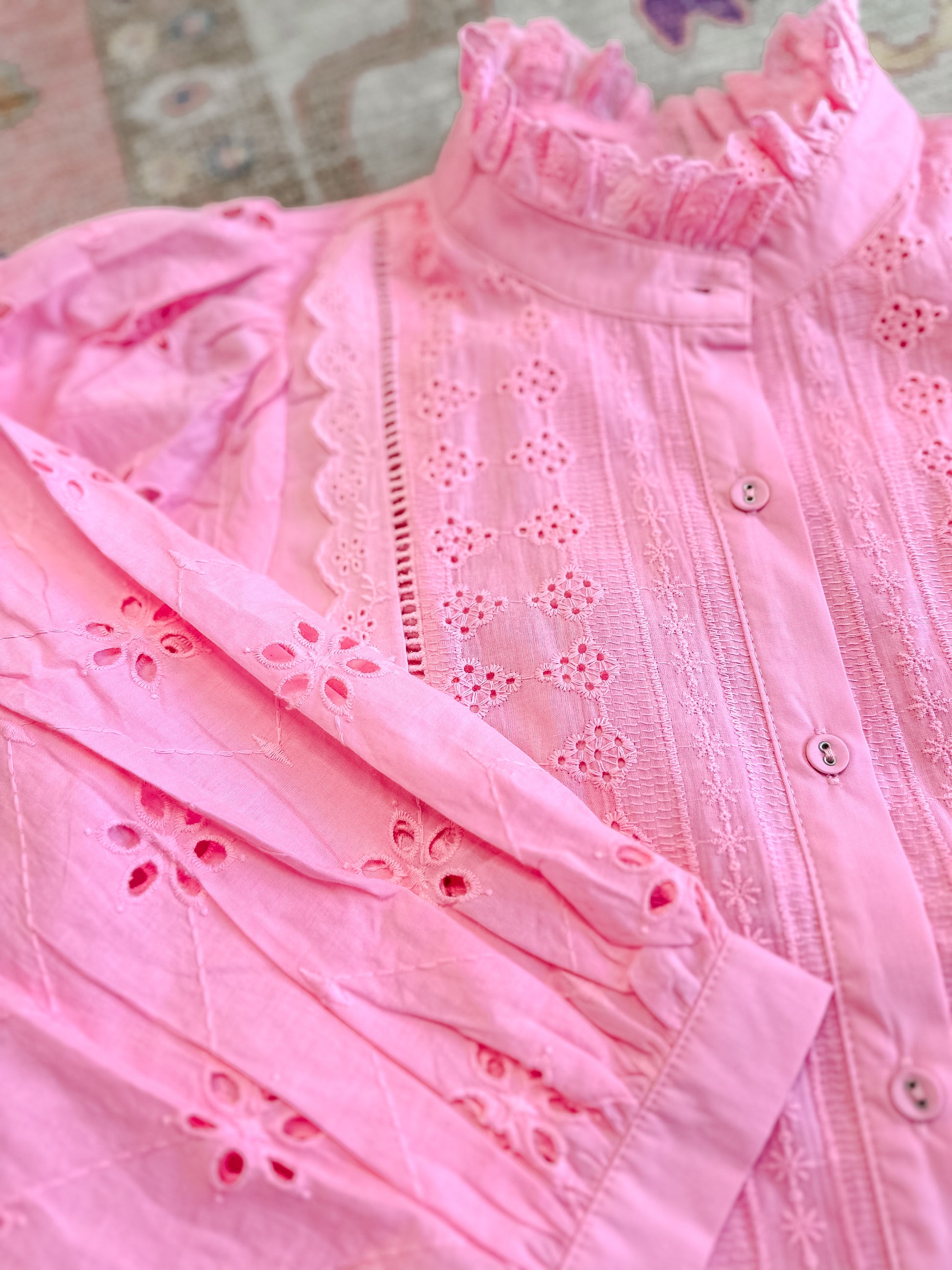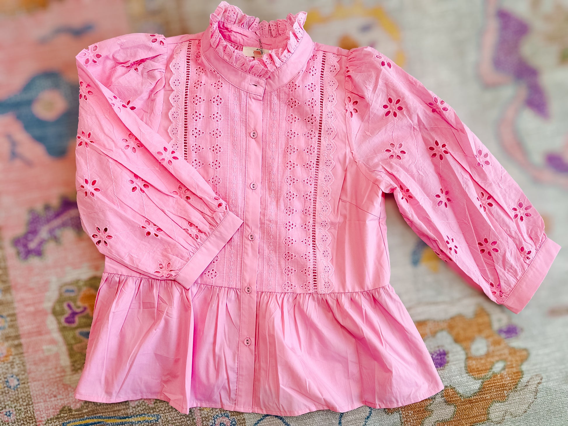 Eyelet lace 3/4 Sleeve Button Up with ruffled neckline