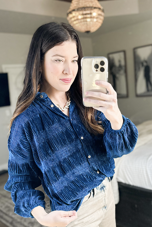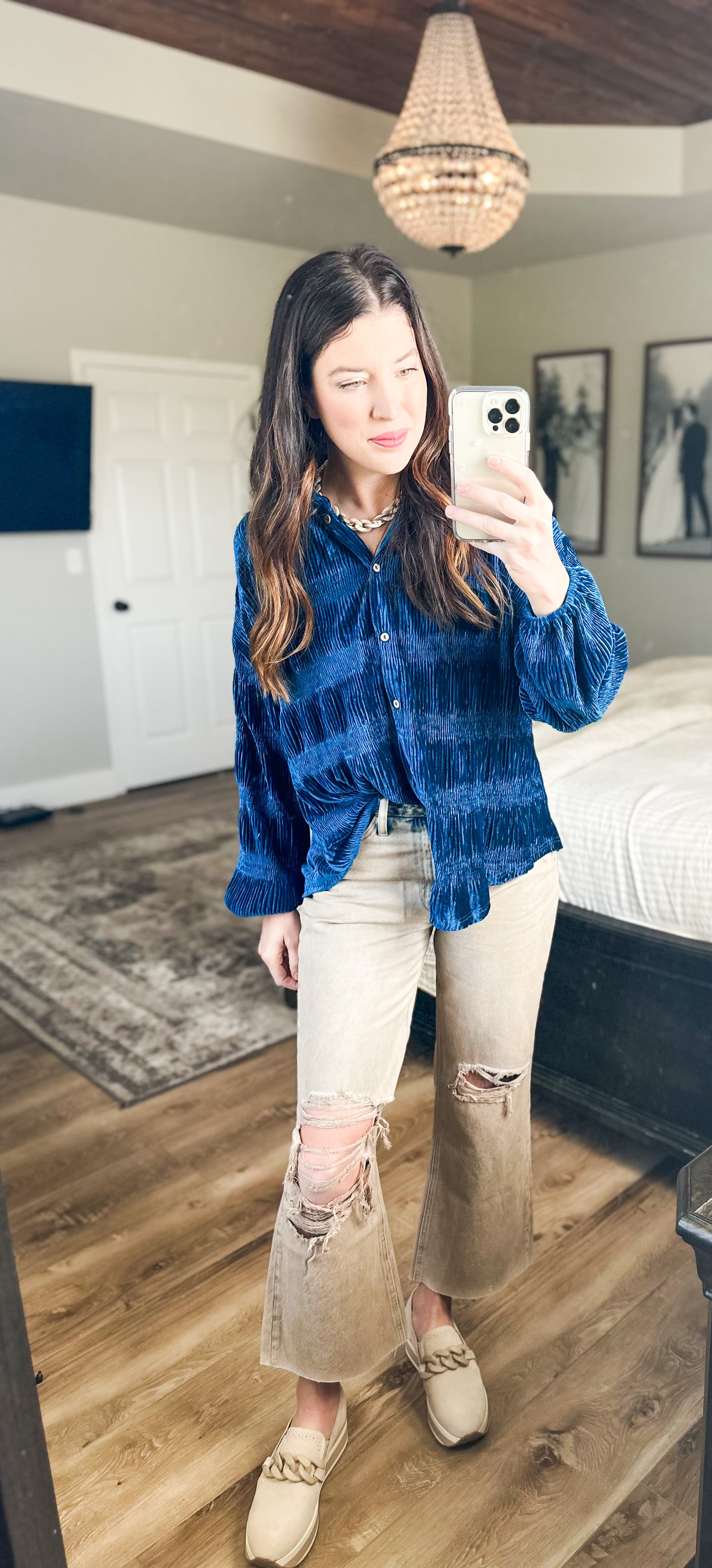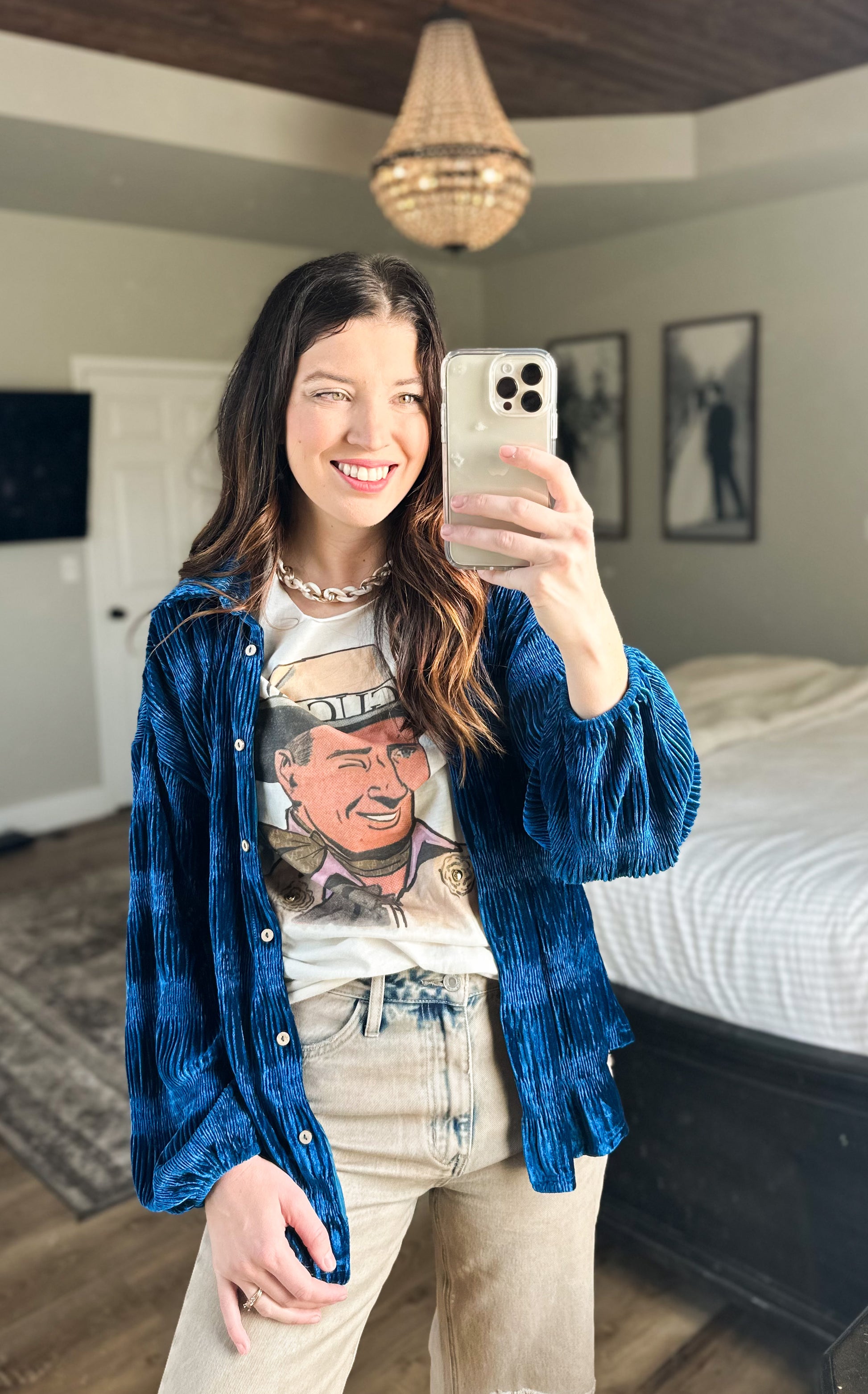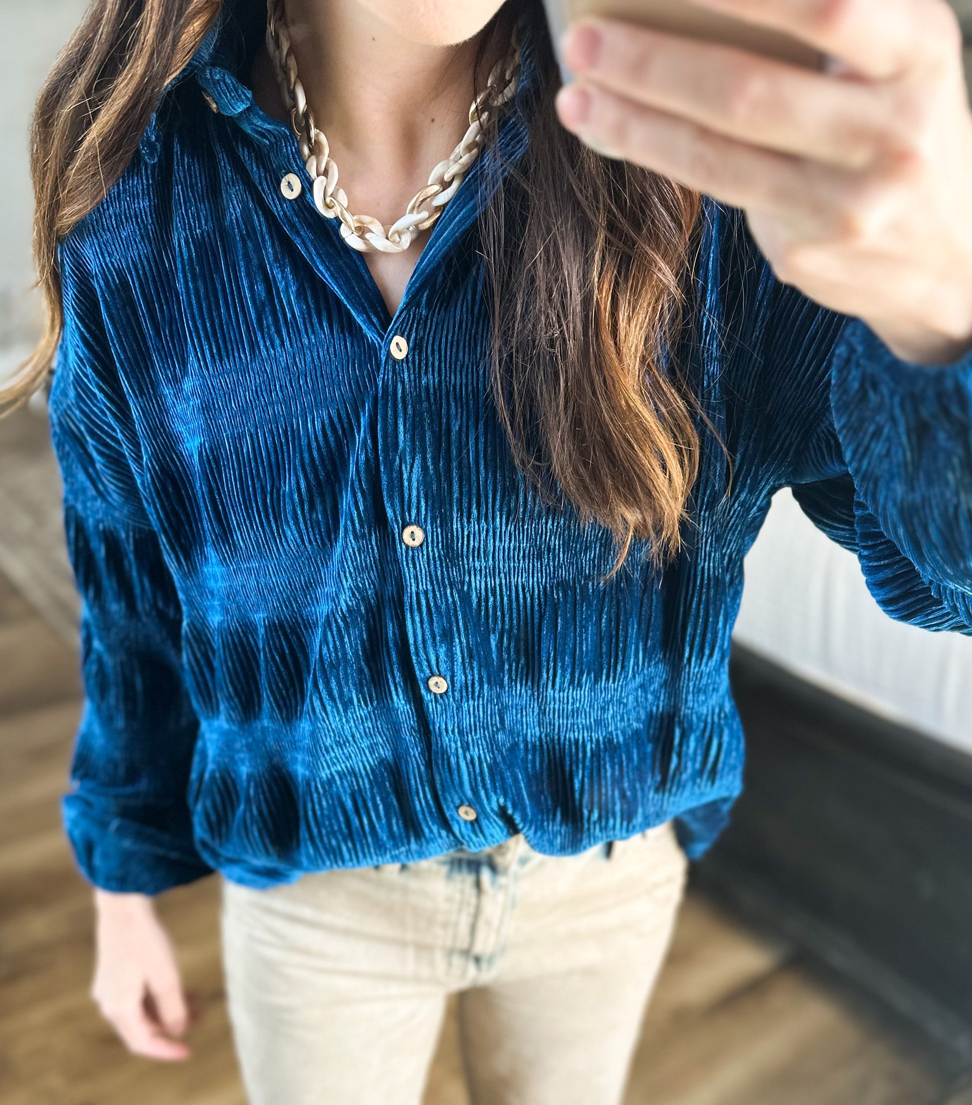 Velvet is so in for the season. This textured button down can be worn as is or layered with your favorite tee. This fits more oversized!