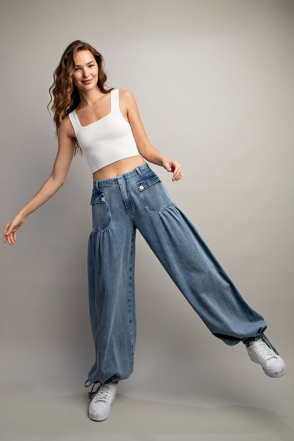 -Solid denim wide leg pants featuring a drawstring cinch tie cuff