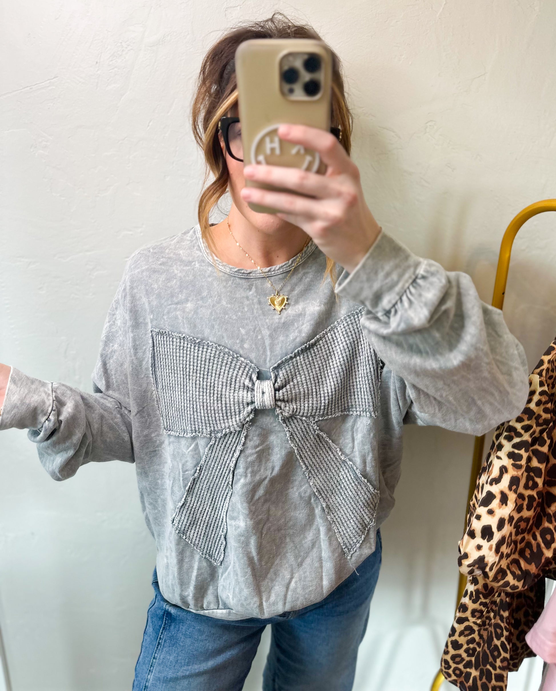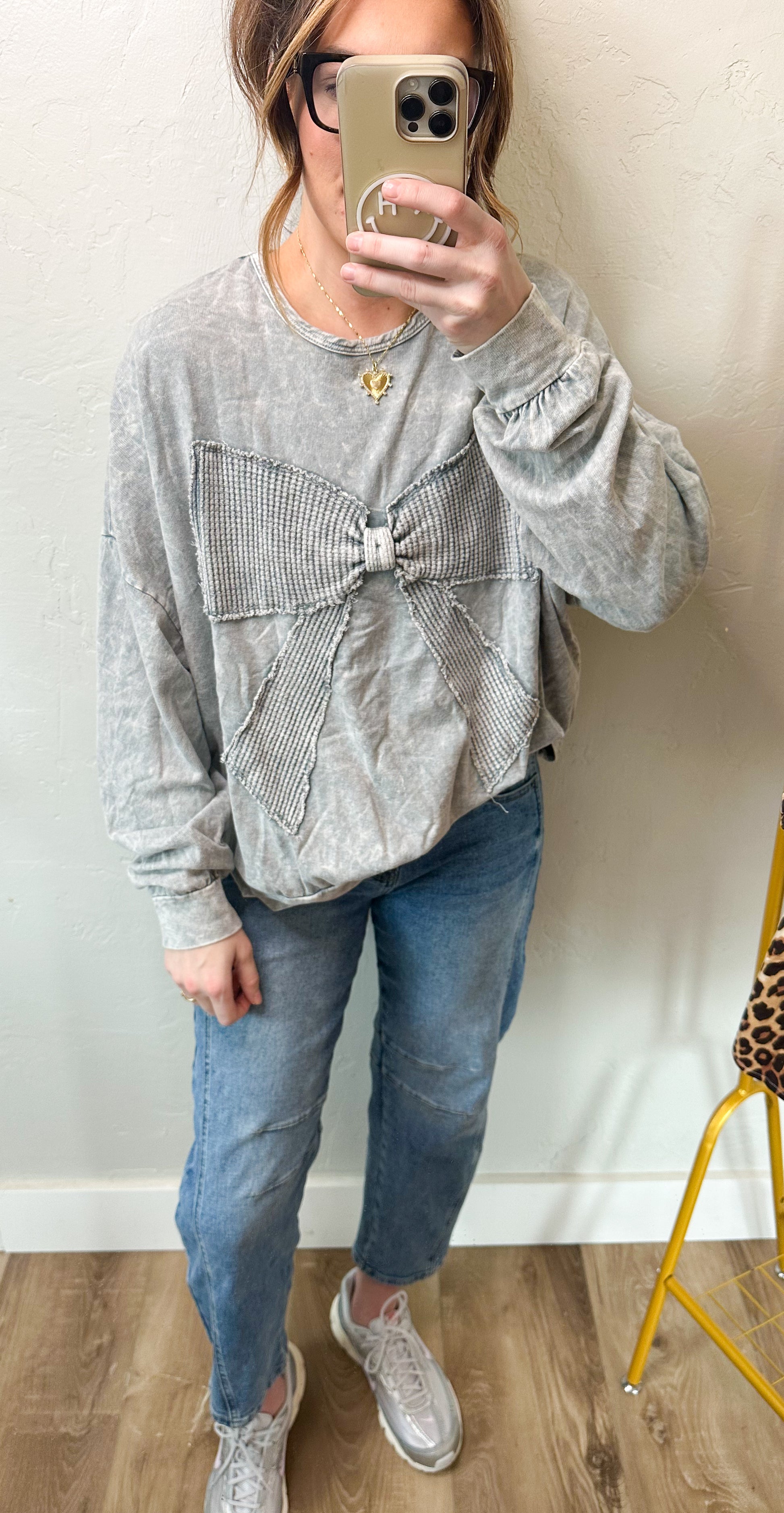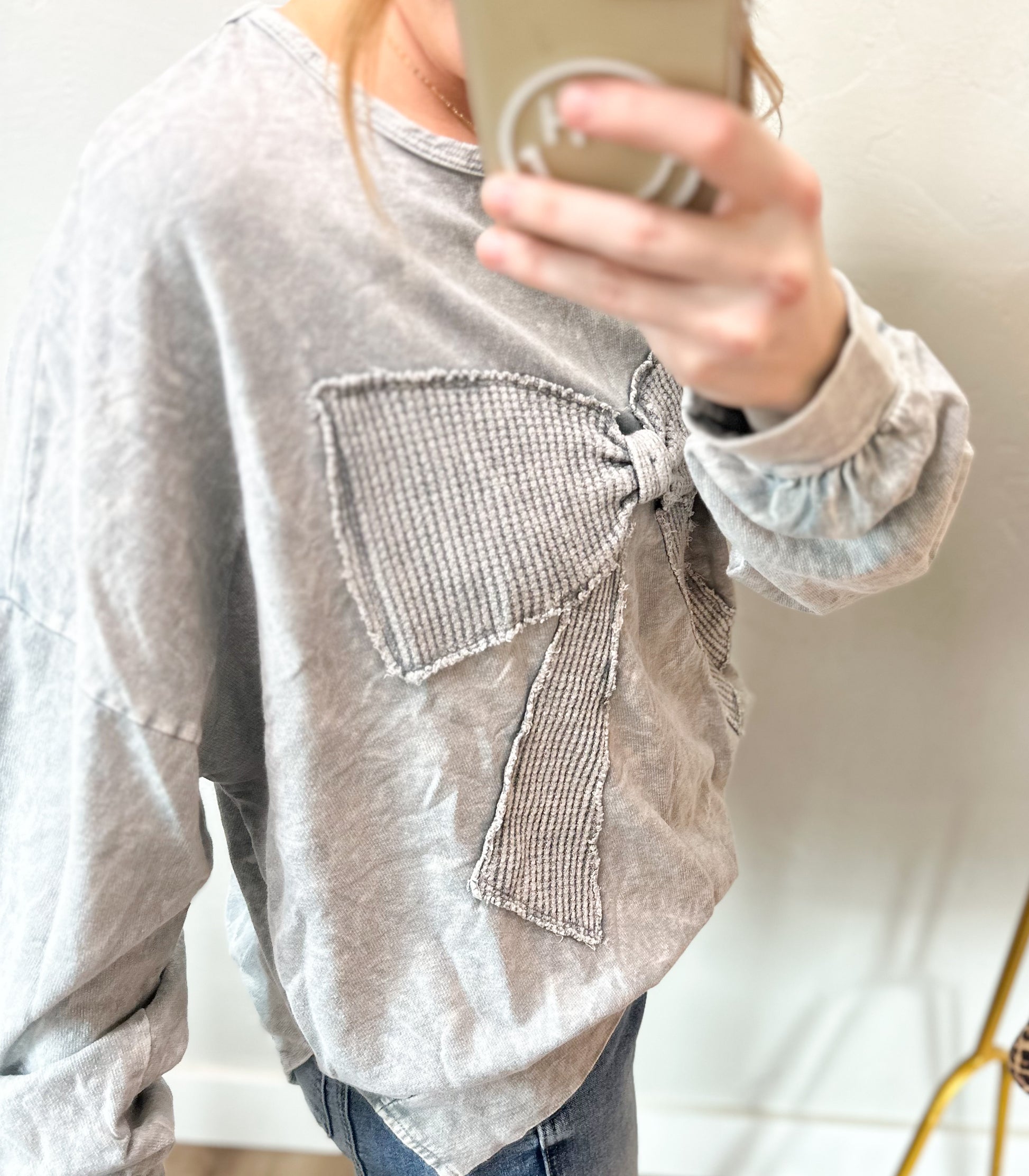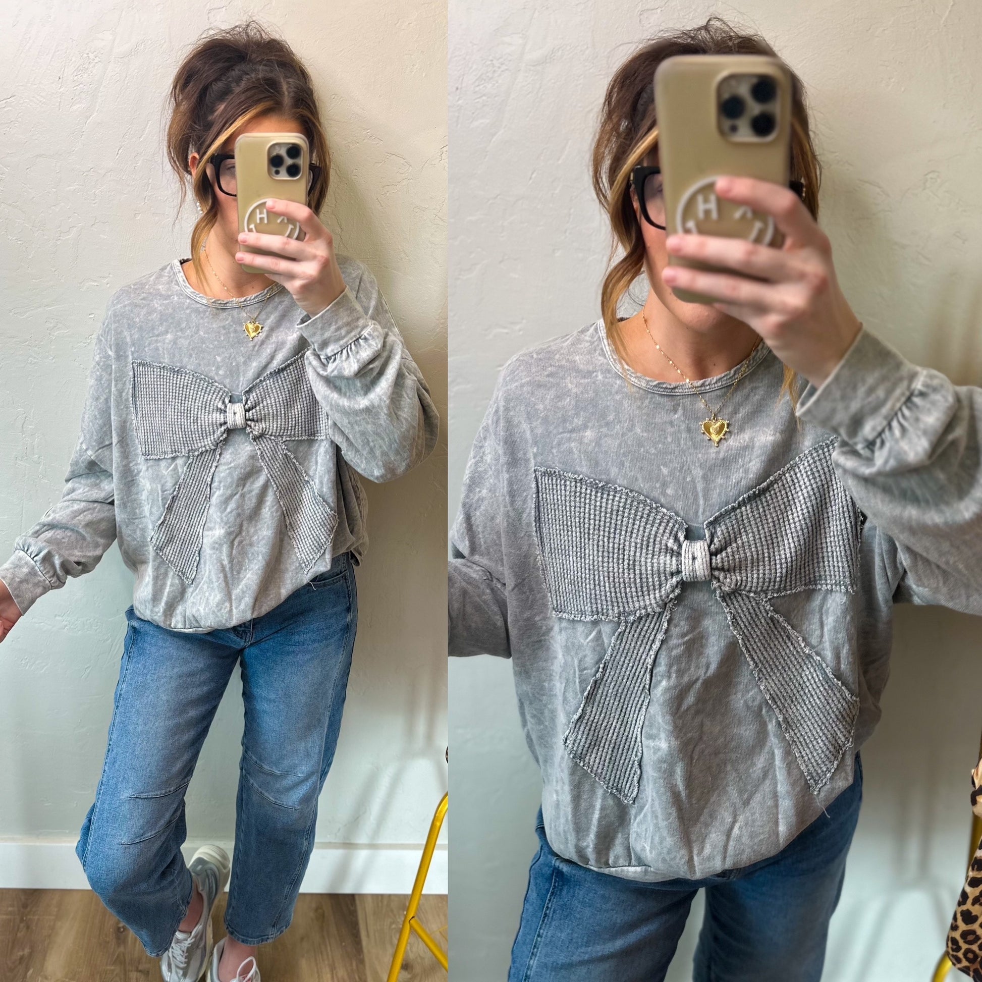 Grey waffle bow crewneck! Terry top.