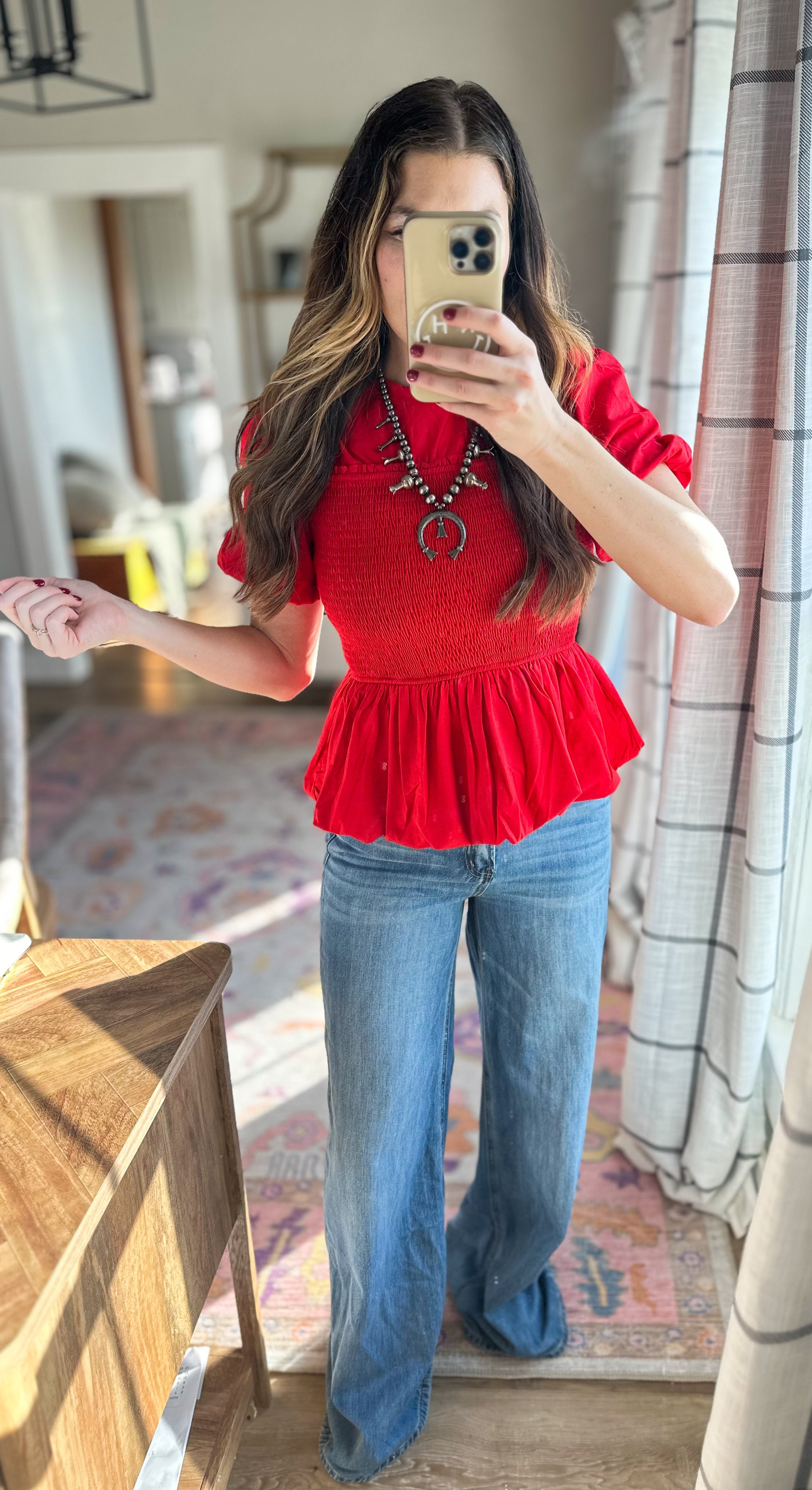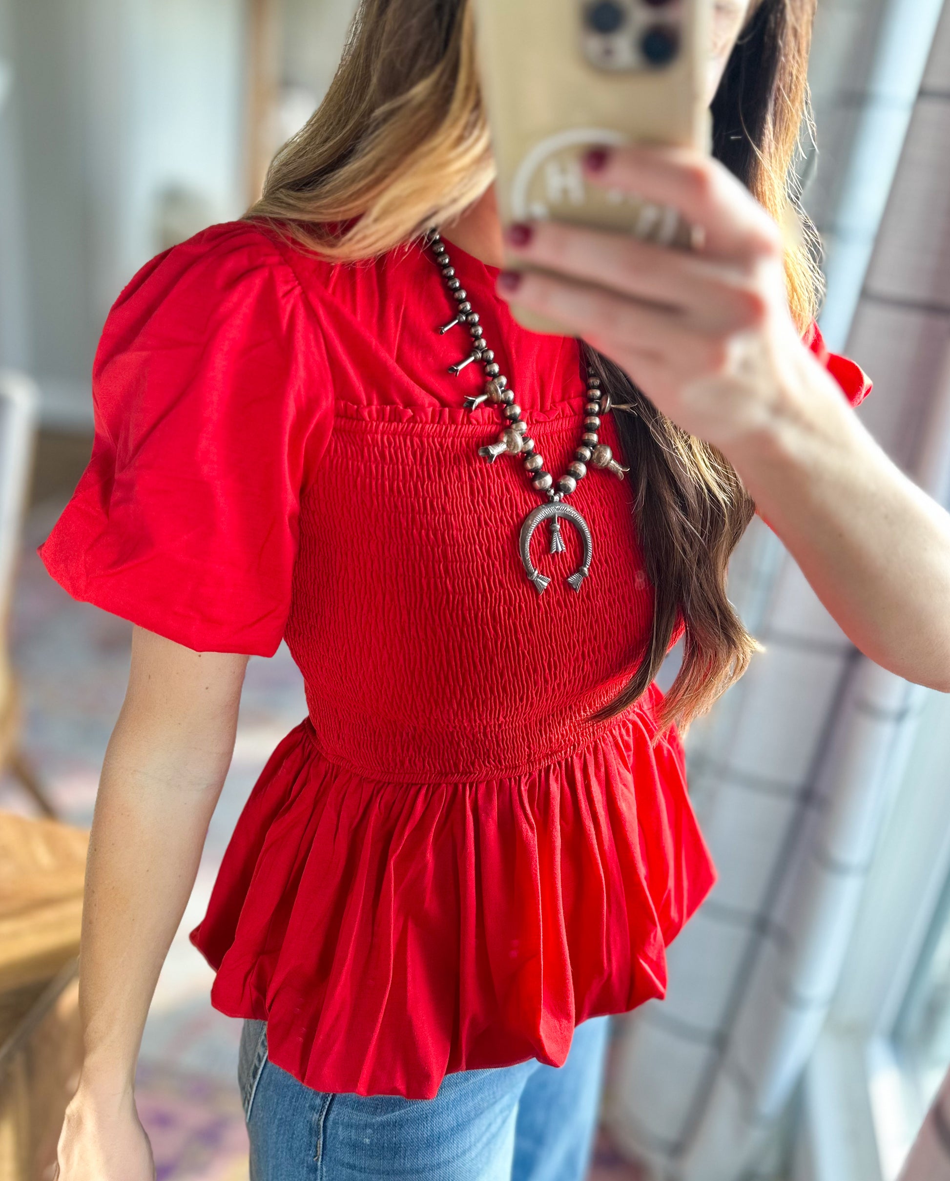 A beautiful red top with puff sleeves, smocked neck & a bubble babydoll bottom!