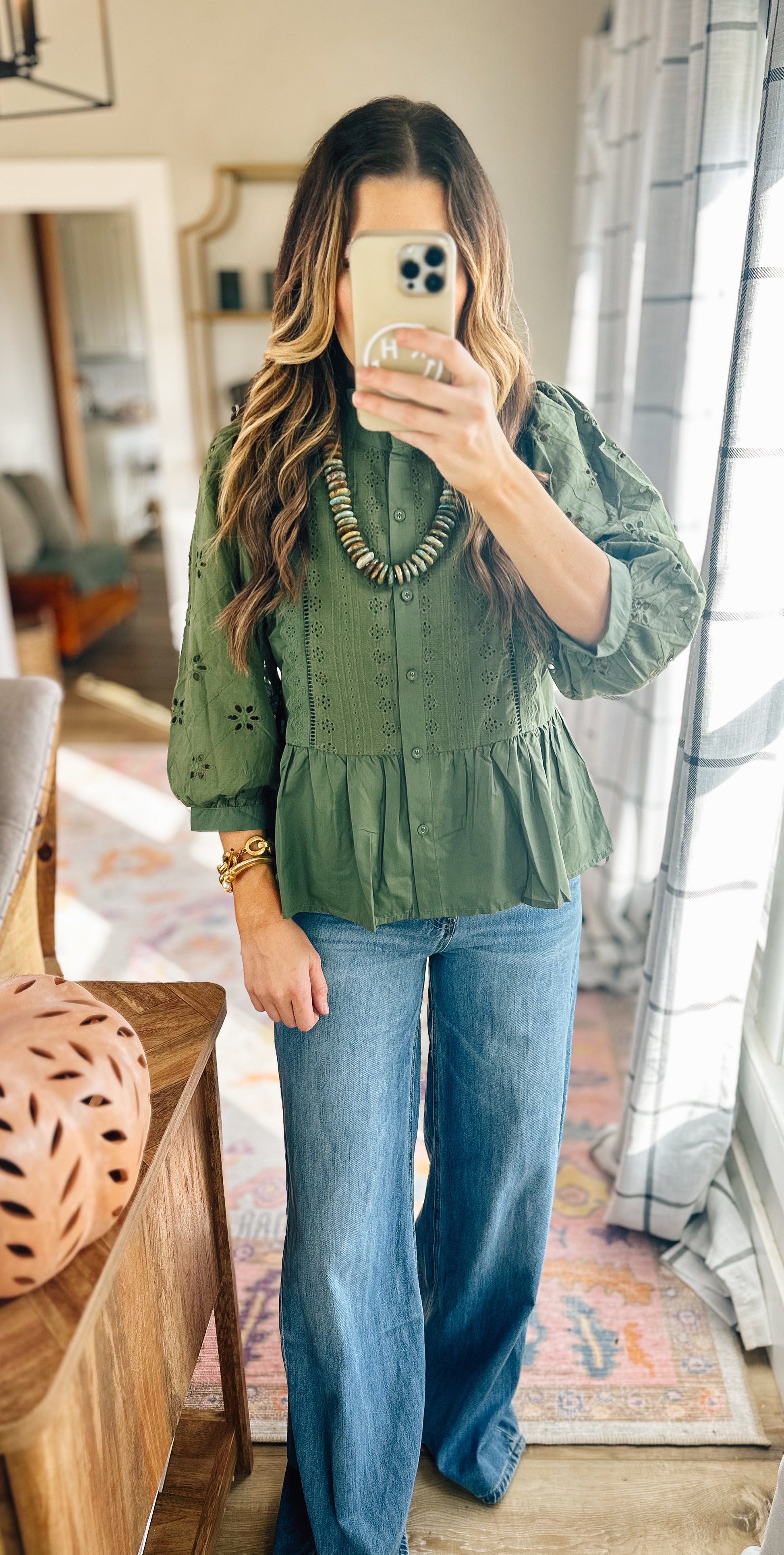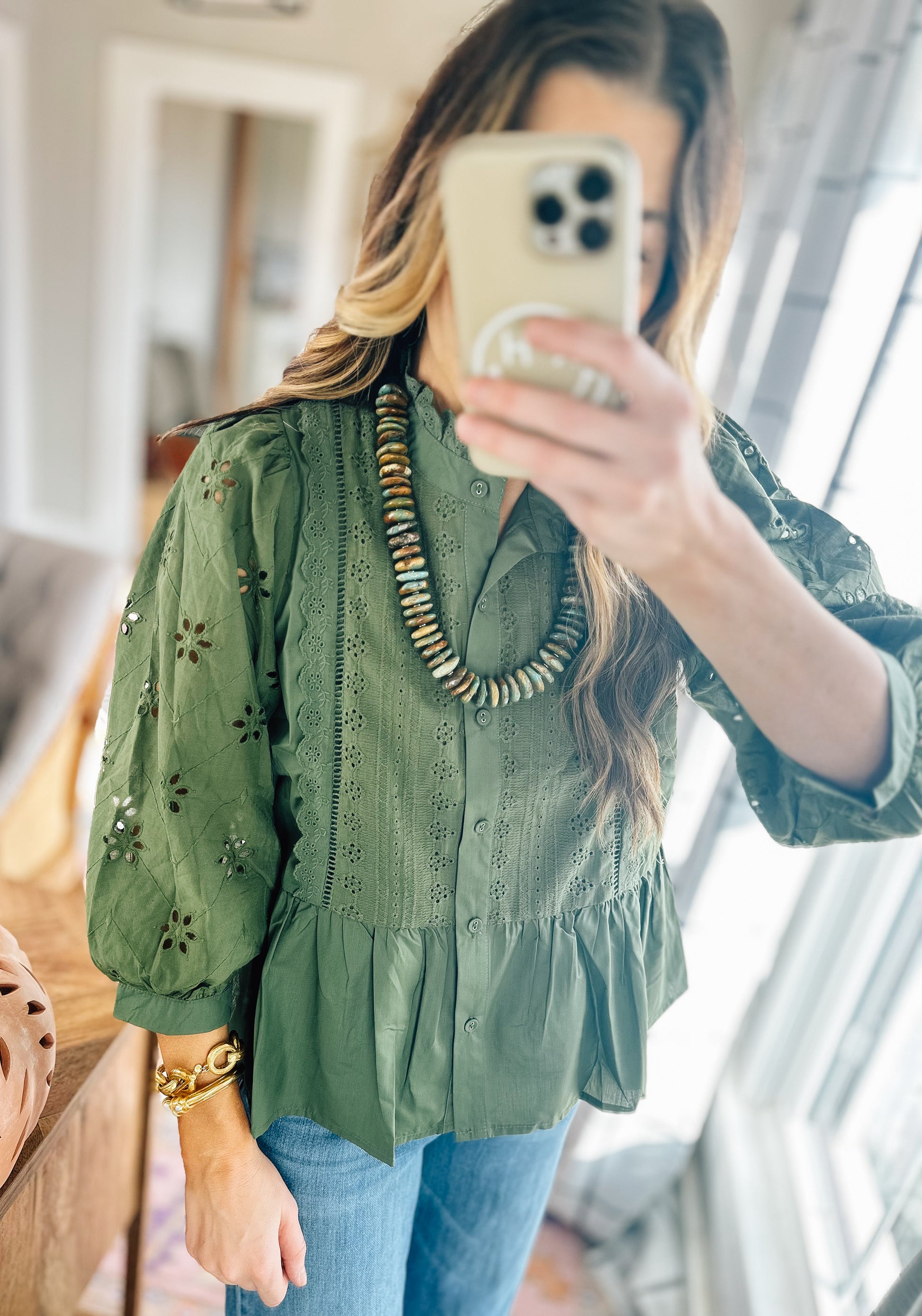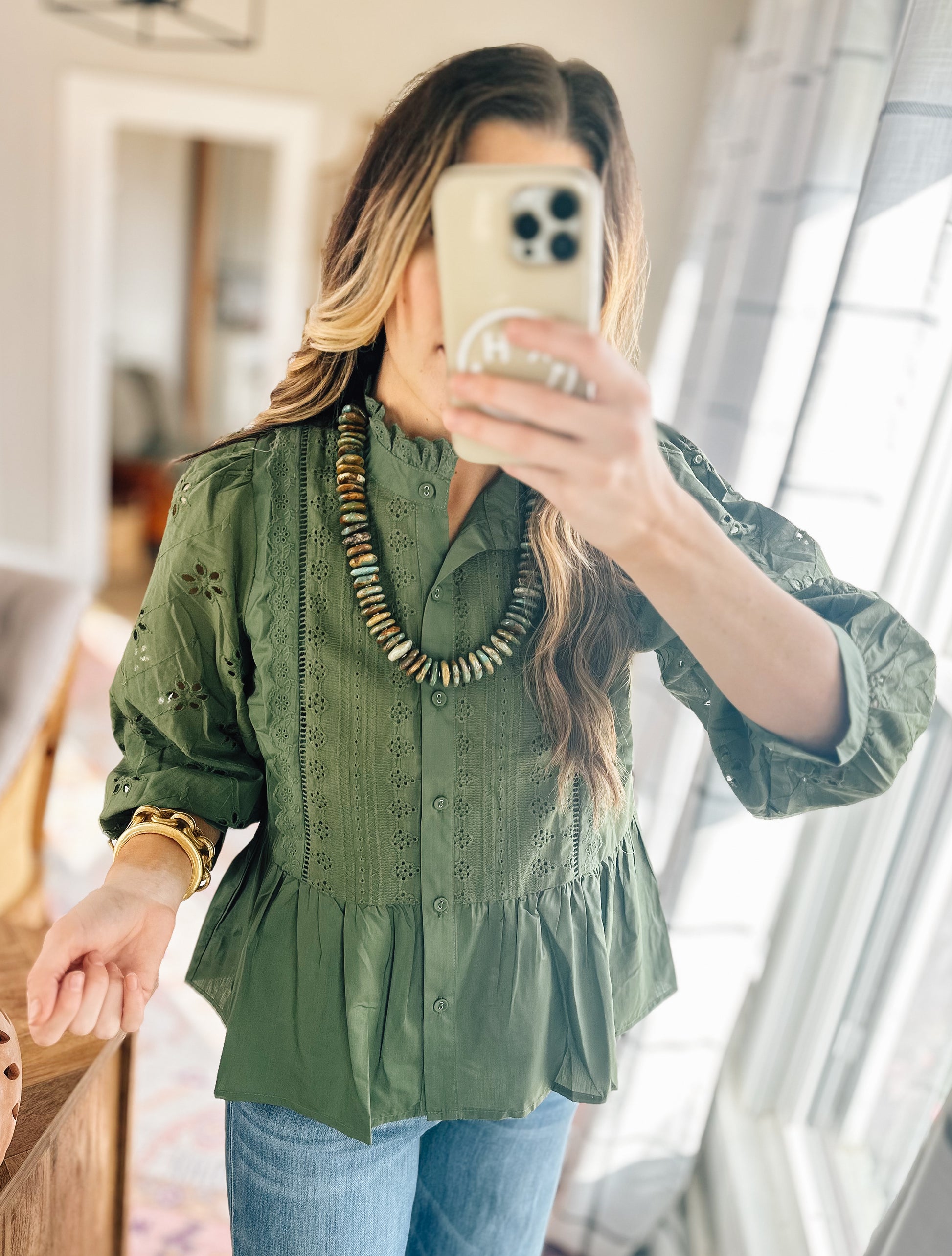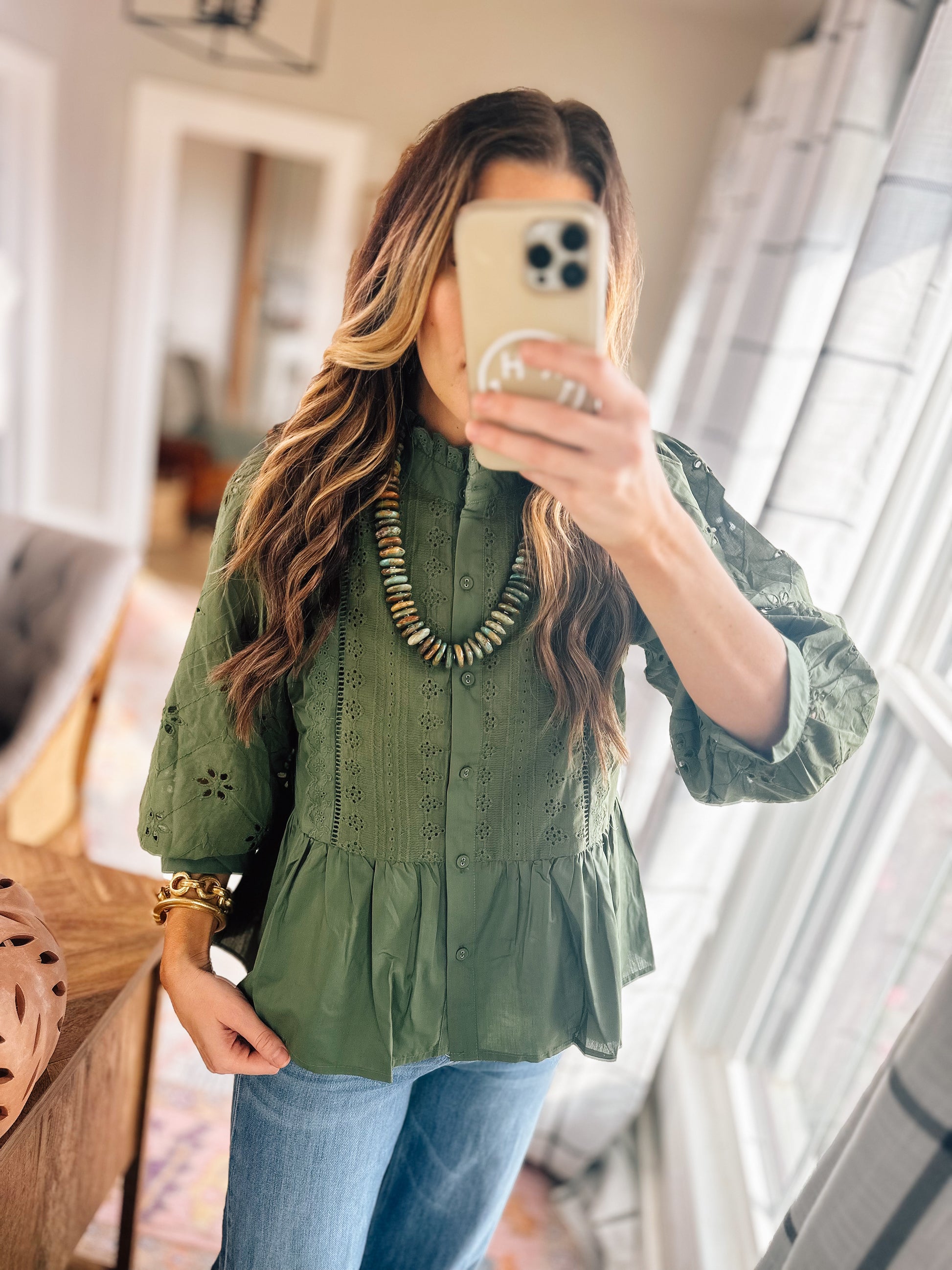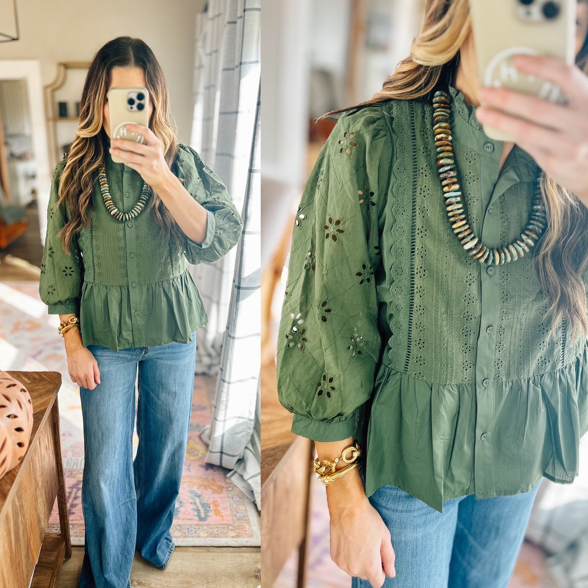 Eyelet lace 3/4 Sleeve Button Up with ruffled neckline