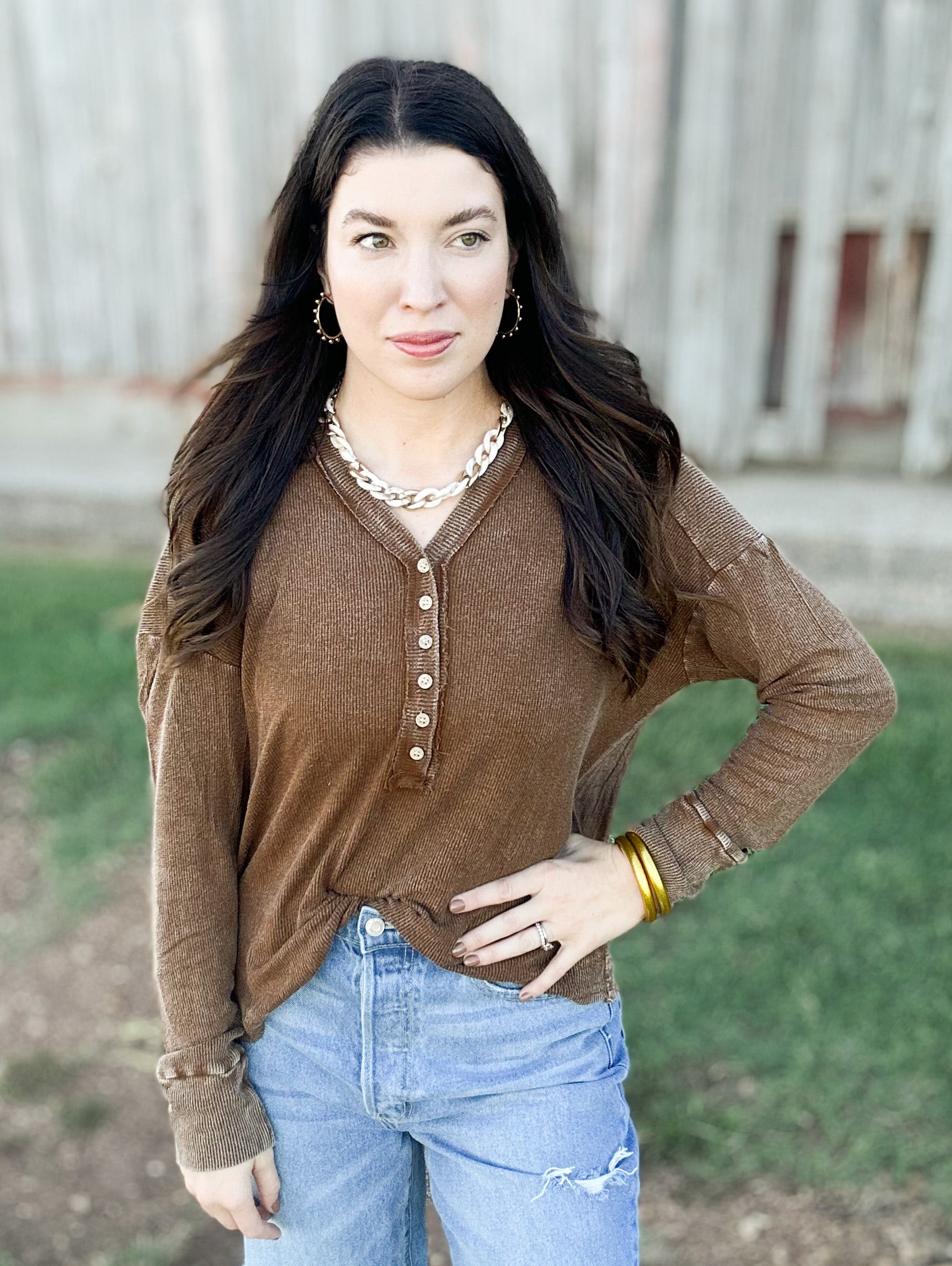 WASHED THERMAL TOP -V NECKLINE -BUTTON CLOSURES -RELAXED AND LOOSE FIT -MINERAL WASHED